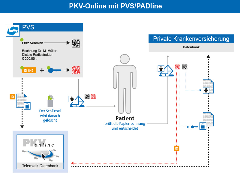 Die Rechnungsdaten selbst werden in anonymisierter Form hochsicher verschlüsselt im Rechenzentrum von PADline vorgehalten und auf Anfrage an die Versicherung gegeben. Eine Entschlüsselung ist nur mit dem Schlüssel möglich, der im Bar-Code auf der Papierrechnung enthalten ist. Niemand, weder Abrechnungsdienstleister noch PADline, kann diese Daten entschlüsseln, wenn die Papierrechnung nicht vorliegt.